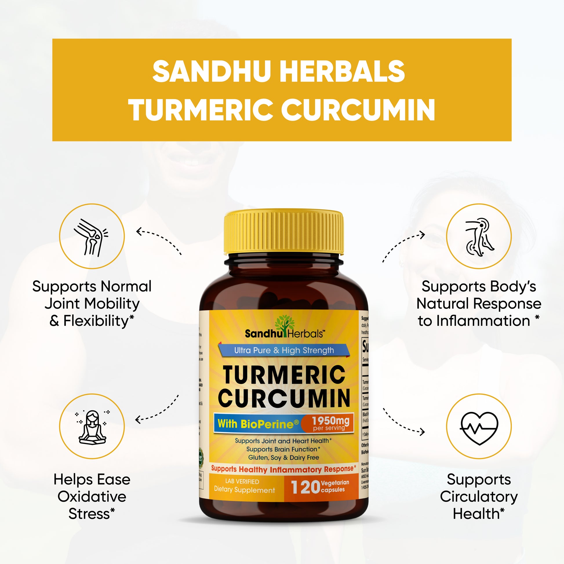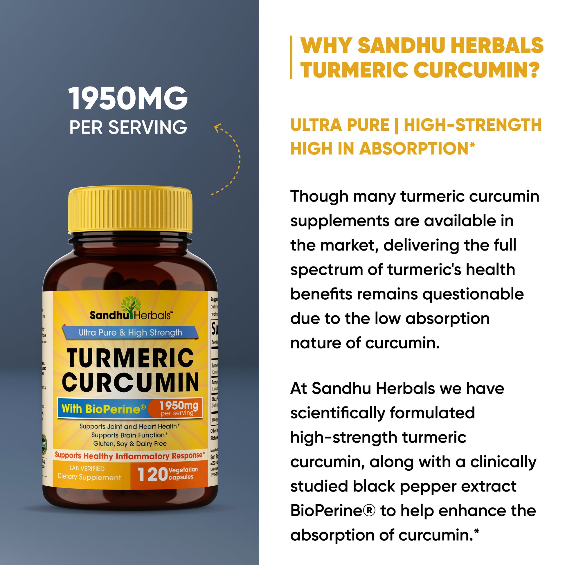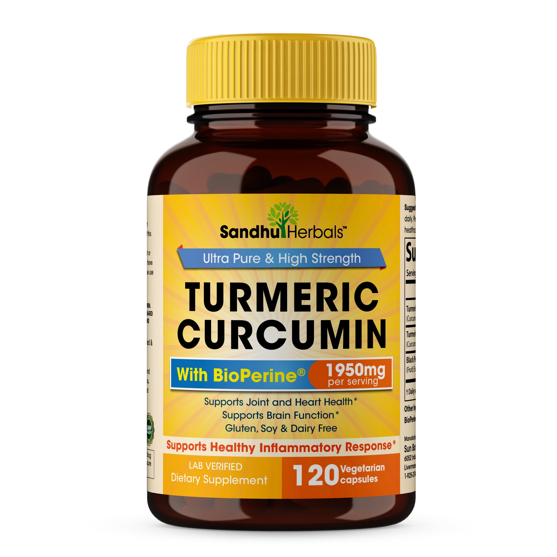 Each serving of Sandhu Herbals Turmeric Curcumin supplement delivers 1950MG, a high strength to support your optimal wellness naturally.*